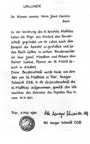 Nachdem Pilgerpater Bernhard immer wieder den Eintritt der Gruppe in die Erzbruderschaft angeregt hatte, fiel auf dem Rückweg der Wallfahrt 1983 in der Kapelle Düttling die Entscheidung. Mit 13 Ja- bei 9 Neinstimmen entschied man sich die Mitgliedschaft zu beantragen. So wurde die Bruderschaft am 06.05.1984 durch Abt Ansgar Schmidt OSB in die Erzbruderschaft des hl. Matthias aufgenommen. Dies geschah in einem feierlichen Hochamt in der Pfarrkirche St. Mariä Geburt und anschließendem Festakt im Josefheim. Hierbei versprach Abt Ansgar spontan mit der Bruderschaft die Wallfahrt einmal mitzumachen. Bereits im Jahr 1985 kam er diesem Versprechen nach. Erster Leiter der Pilgergruppe und Brudermeister war von 1980 bis 1986 Josef Maahsen. Ab 1986 bis zum heutigen Tag ist Heinz-Peter Schmitz unser 1. Brudermeister.